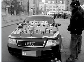 賣鞋男子說,他是給別人送貨的,專送李寧牌鞋,這些都是庫里的陳貨,老款鞋低價處理。開奧迪車擺攤,一方面用來吸引路人眼球,一方面也為了防止鞋子被弄臟,同時還不占路邊的人行道。