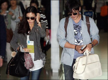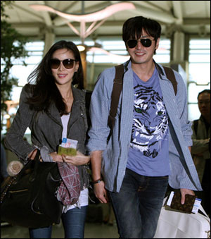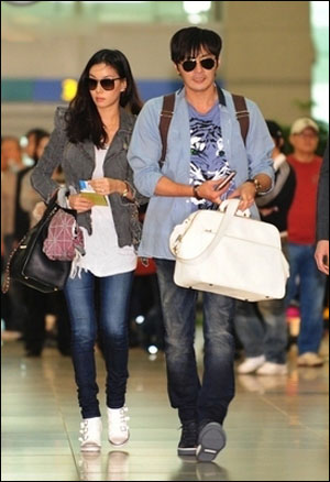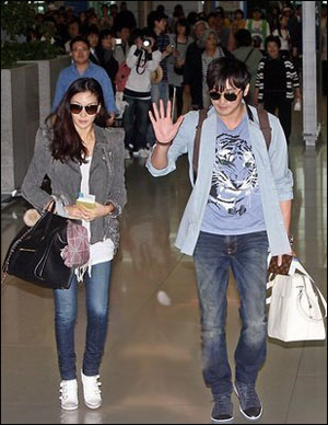 張東健夫婦復古休閑鞋服出現機場 開始蜜月之旅