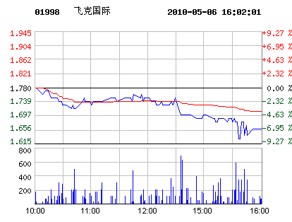 | 飛克國際代碼:01998.hk | 1.640.14 7.87%2010-05-06 16:14:46 | 昨收:1.78 今開:1.78 成交:19,400最高:1.78 最低:1.63 均價:1.7流通:8.00億 市值:13.12億 換手:0.00% |