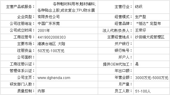 自2000年通過'ISO9000',并于2004年通過了'ISO9001:2000'品質(zhì)認(rèn)證以來,我們不斷改善自己的產(chǎn)品品質(zhì),提倡“為客戶提供滿意的產(chǎn)品、交期和服務(wù)”的品質(zhì)方針,并不斷地營造良好的企業(yè)文化;同時,不斷的充實,壯大自己,以提高產(chǎn)品質(zhì)量為先導(dǎo)、規(guī)范化的生產(chǎn)模式來贏得市場,與鞋業(yè)界各位同仁共謀合作,共同發(fā)展;竭誠歡迎廣大客戶蒞臨本公司參觀,洽談訂購,來料加工!