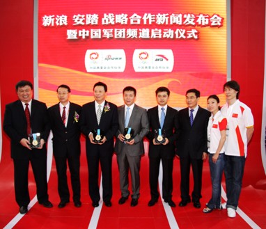 在活動現(xiàn)場,國家體育總局副局長、中國奧委會副主席楊樹安、新浪首席執(zhí)行官曹國偉先生、安踏體育用品有限公司董事局主席兼首席執(zhí)行官丁世忠先生共同啟動了“安踏.新浪中國軍團頻道”的上線儀式。安踏董事局主席兼首席執(zhí)行官丁世忠先生表示,雙方志在打造一個讓網(wǎng)友了解中國體育軍團信息內(nèi)容最豐富、最權(quán)威、最及時的網(wǎng)絡(luò)平臺。新浪表示,安踏·新浪中國軍團頻道將包括資訊、圖片視頻、知識堂、博客訪談、互動和產(chǎn)品等六大板塊,新浪將集全站最優(yōu)質(zhì)的資源對安踏·新浪中國軍團頻道進行推廣。新浪同時表示,在安踏·新浪中國軍團頻道中,將為安踏實現(xiàn)最具價值的營銷植入,比如通過新浪微博、冠軍訪談、互動板塊、產(chǎn)品板塊等等。