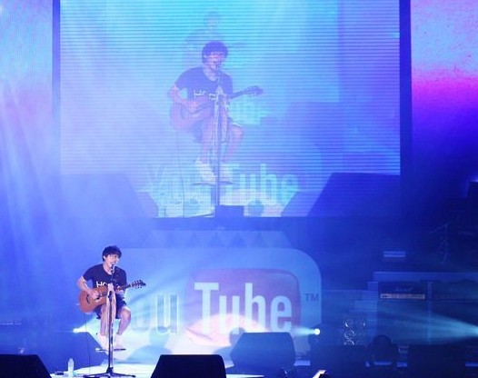 搞怪歌手盧廣仲簡單T恤衫白色板鞋安靜地彈奏吉他傾情演唱