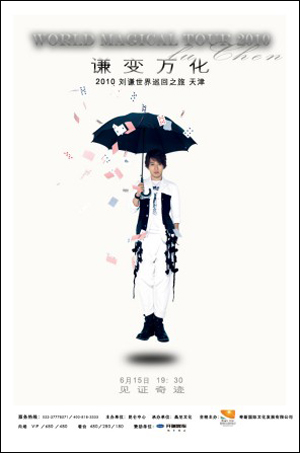 中國鞋網05月24日訊,日前,劉謙2010“謙變萬化”世界巡演新海報曝光,在全新海報圖中,劉謙身穿白色T恤黑色馬甲腳登黑色短靴,其中還撐著一把黑色的傘呈懸浮狀漂在空中,同時劉謙首次以少見的卷發造型示人,并一改往日的親和風格,大膽嘗試冷酷視覺系,空中降落下的“撲克雨”也讓整個畫面充滿創意。