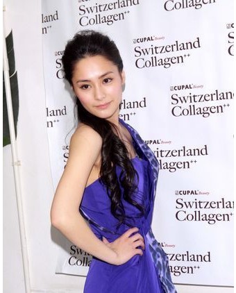 鐘欣桐身穿紫色半露肩連衣裙搭配高跟鞋拍廣告