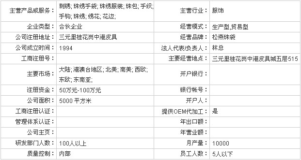 廣東省潮州市松燕珠袋工藝有限公司歡迎各界人士來電來人參觀洽談!