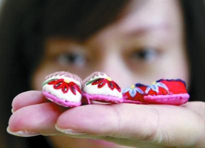 中國鞋網06月12日訊,上海市長寧區仙霞社區文化活動中心四樓展廳,300余雙手工制作的迷你繡花鞋令參觀者嘖嘖稱奇,而更令人驚嘆的是,這全部出自一位百歲老人之手。今年已105歲高齡的朱僅君老人,9歲就拿起了繡花針。老人的媳婦說,1996年老人去成都二兒子家居住,閑來無事想起了做繡花鞋,“一開始做孩子的虎頭鞋,后來越做越小,越做越精。 ”記者昨天在展覽現場看到,老人做的繡花鞋最小的只有拇指指甲蓋大,但色彩鮮艷,造型各異,有傳統戲曲鞋、十二生肖鞋、兒童虎頭鞋等,300余雙沒有一雙造型重復。