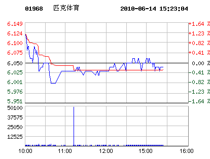 | 匹克體育代碼:01968.hk | 6.040.01 0.17%2010-06-14 15:23:06 | 昨收:6.05 今開:6.14 成交:65,990最高:6.14 最低:6.00 均價:6.03流通:20.98億 市值:126.71億 換手:0.00% |
