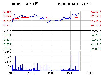 | 361度代碼:01361.hk | 5.840.14 2.46%2010-06-14 15:25:06 | 昨收:5.70 今開:5.80 成交:37,558最高:5.85 最低:5.72 均價:5.8流通:20.65億 市值:120.62億 換手:0.00% |