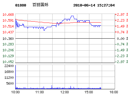 | 百麗國際代碼:01880.hk | 10.520.16 1.54%2010-06-14 15:28:09 | 昨收:10.36 今開:10.60 成交:84,260最高:10.64 最低:10.46 均價:10.49流通:84.34億 市值:887.28億 換手:0.00% |