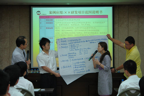 課程中,他還重點分享交流了項目管理的基礎和核心——范圍管理。培訓現場,學員們被分成6組進行了“編寫項目范圍說明書”、“分解項目工作結構”、“項目工作清單列舉”等內容的模擬演練。在項目范圍說明書演練環節,一些學員編寫的“2010年夏季服裝庫存消化”、“福州市場開發”、“端午節促銷”等項目得到了大家的充分肯定。