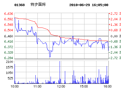 | 特步國際代碼:01368.hk | 6.350.11 1.70%2010-06-29 16:07:27 | 昨收:6.46 今開:6.60 成交:38,425最高:6.60 最低:6.30 均價:6.41流通:21.74億 市值:138.07億 換手:0.00% |