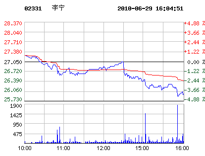 | 李寧代碼:02331.hk | 26.250.80 2.96%2010-06-29 16:08:00 | 昨收:27.05 今開:27.25 成交:20,213最高:27.25 最低:25.85 均價:26.38流通:10.50億 市值:275.73億 換手:0.00% |