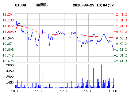 | 百麗國際代碼:01880.hk | 10.840.10 0.91%2010-06-29 16:08:00 | 昨收:10.94 今開:11.00 成交:123,641最高:11.18 最低:10.80 均價:10.92流通:84.34億 市值:914.27億 換手:0.00% |