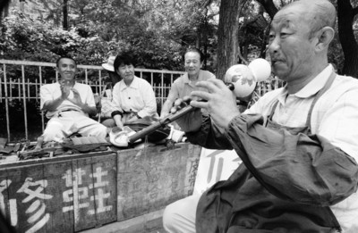 沒了顧客,老謝把手用肥皂洗了3遍,才從鞋架子最里面把葫蘆絲拿出來。是一個景泰藍的瓷葫蘆絲,很漂亮。平時老謝就帶著這把380元的葫蘆絲,樂友過來就得跟他這個調。“我一打手機,他們就過來。真的,我這人能聯系人,不煩人。”老謝說的“他們”就是樂友。有的是退休的,有的現在還干著理發攤。“拉二胡、彈手風琴的,有30來人呢。 ”