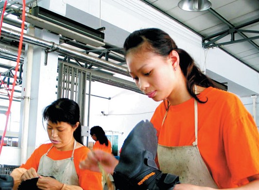 中國鞋網7月13日訊, 近年來,山東省高密市制鞋業堅持自主創新,轉方式、調結構,加大科技投入,使產業不斷壯強做大。其中,生產的軍警類、勞保類產品在國際市場非常走俏。圖為盛昊鞋業公司職工在為意大利軍警生產軍用皮靴。