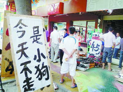 前天,由于店面內(nèi)部裝修,賣鞋的店家直接把攤位搬到店外,大聲吆喝叫賣起來(lái),還立著兩塊寫著“今天不走是小狗”的招牌。行人路過(guò),紛紛議論:這是店家玩的把戲吧。