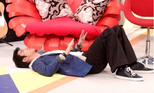 但是一向喜歡哪壺不開提哪壺的小S,今天又故意開始提緋聞話題,王力宏馬上平躺在地上藉以紓壓,小S有樣學樣,覺得她要問的問題壓力太大,自個兒也平躺在地上,搞得現場笑聲不斷。
