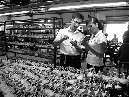 中國鞋網7月26日訊, 龍巖檢驗檢疫局在“質量提升”活動中,采取多項措施,幫促轄區內企業完善質量管理體系,落實“一廠一策”制度,重視“安全、衛生、環保”,切實提高出口產品質量,1月至6月,該局轄區內出口產品120批、貨值390萬美元,同比分別增長45%和44%。圖為該局監管人員在企業生產一線進行指導。