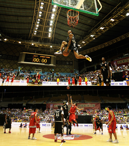比賽一開始,本土作戰(zhàn)的STREET CHINA就表現(xiàn)出飽滿的斗志,TS首先以一個(gè)漂亮的突破反手上籃先得兩分。不過,沒有料到的是,在這兩分之后,便開始進(jìn)入了S.K.Y.時(shí)間,BIG SWOAL的空中接力、HELICOPTER直升機(jī)般的垂直暴扣、AO魔術(shù)般的運(yùn)球過人引得現(xiàn)場(chǎng)觀眾驚叫連連,直到比分在21比2的時(shí)候,STREET CHINA才開始有所起色,通過罰球和快攻上籃將比分拉近。但是,昨天S.K.Y.并沒有準(zhǔn)備給STREET CHINA機(jī)會(huì),他們用禁閉盯人遏制了STREET CHINA的進(jìn)攻,并且用犀利的反擊在第二節(jié)就將中國球員們徹底擊倒,下半場(chǎng)便進(jìn)入了所謂的“垃圾時(shí)間”。