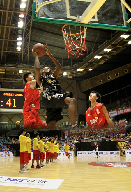 雖然比分的劣勢(shì)已經(jīng)無法挽回,但這并不影響比賽的精彩程度。HOT DOG和對(duì)方球員GUY的對(duì)決就贏得了現(xiàn)場(chǎng)觀眾的陣陣掌聲。而中場(chǎng)休息的時(shí)候,S.K.Y.還與中國民間扣將,也是STREET CHINA的北京5強(qiáng)選手朱炎淼進(jìn)行了一場(chǎng)精彩的扣籃對(duì)決。現(xiàn)場(chǎng)觀眾著實(shí)享受了一場(chǎng)原汁原味的街頭籃球大餐。最后,S.K.Y.街球隊(duì)以106比53的懸殊比分戰(zhàn)勝了STREET CHINA。