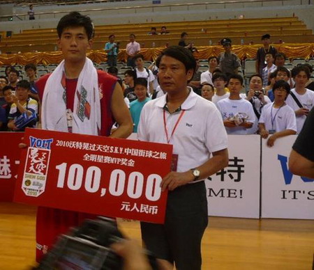 終場(chǎng)哨響,STREET CHINA的球員們抱作一團(tuán),一個(gè)多月下來(lái),8位球員之前早就產(chǎn)生了兄弟情誼,但是今晚會(huì)在他們中間產(chǎn)生一名MVP球員,評(píng)審團(tuán)在本場(chǎng)表現(xiàn)出色的褚文浩、HOT DOG以及三場(chǎng)比賽均有穩(wěn)定表現(xiàn)的BILLY三人中間產(chǎn)生了分歧,最后還是一致通過(guò),“上海小子”褚文浩成為了第一屆沃特晃過(guò)天空中國(guó)街球之旅的MVP球員,賽事贊助商沃特集團(tuán)董事長(zhǎng)、總裁蔡金輝先生為他頒上了MVP獎(jiǎng)杯以及10萬(wàn)元現(xiàn)金大獎(jiǎng)的支票。褚文浩表示,今年隊(duì)友們都表現(xiàn)得非常出色,這個(gè)MVP獎(jiǎng)杯應(yīng)該是屬于大家的,明年他一定還會(huì)來(lái)參加晃過(guò)天空的比賽。