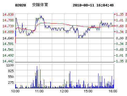 | 安踏體育代碼:02020.hk | 14.800.16 1.09%2010-08-11 16:12:15 | 昨收:14.64 今開(kāi):14.60 成交:32020最高:14.82 最低:14.54 均價(jià):14.73流通:24.93億 市值:369.03億 換手:0.00% |