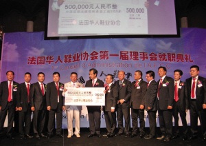 在就職典禮上,法國華人協會本著“患難相恤、大愛無疆”的仁愛精神,向甘肅舟曲特大山洪泥石流受災同胞捐款50萬元人民幣建設學校。孔泉代表祖國、代表災區接受捐贈,并高度贊揚協會的義舉。