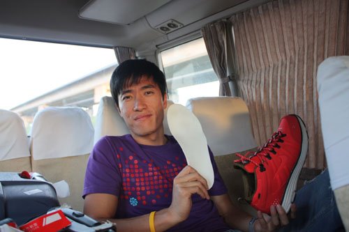 “不錯,蠻好的,是根據我的腳部特制的,穿起來感覺不錯,把腳底板中間兩側那一塊正好墊上……”劉翔在回來的路上跟記者介紹道,或許怕記者不太明白,他干脆脫下鞋,把類似鞋墊的鞋模拿了出來。