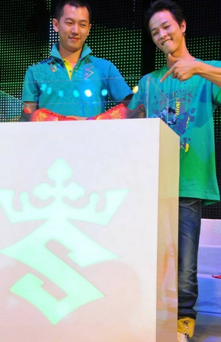 圖為丁俊賢(左)與南賢俊(右)共同發布“舞王”系列板鞋