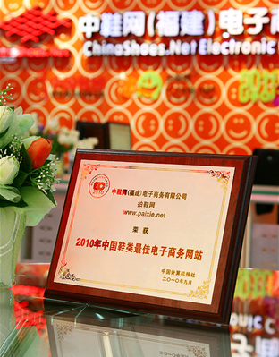 中國計(jì)算機(jī)報(bào)和賽迪傳媒于2010年聯(lián)合舉辦的“2010年最具價(jià)值行業(yè)電子商務(wù)網(wǎng)站”評選活動(dòng)中,經(jīng)過專業(yè)評審團(tuán)3個(gè)月的綜合測評,中鞋網(wǎng)(福建)電子商務(wù)有限公司旗下的B2C平臺拍鞋網(wǎng)最終獲得“2010年中國鞋類最佳電子商務(wù)網(wǎng)站”榮譽(yù)稱號。