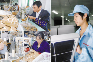 秦志平在流水線上縫制鞋幫。何素容在流水線上縫制鞋幫。秦濤在包裝太陽能電池板。
