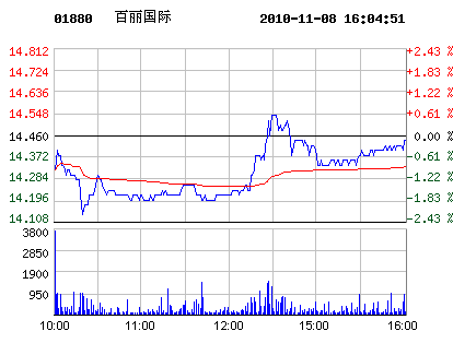 | 百麗國際代碼:01880.hk | 14.580.12 0.83%2010-11-08 16:13:03 | 昨收:14.46 今開:14.32 成交:88441最高:14.66 最低:14.14 均價:14.40流通:84.34億 市值:1229.71億 換手:0.00% |