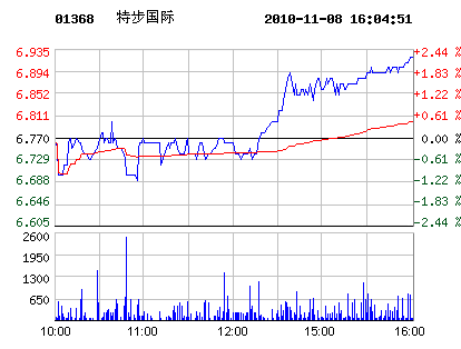 | 特步國際代碼:01368.hk | 6.930.16 2.36%2010-11-08 16:12:45 | 昨收:6.77 今開:6.76 成交:63199最高:6.94 最低:6.68 均價:6.82流通:21.76億 市值:150.80億 換手:0.00% |