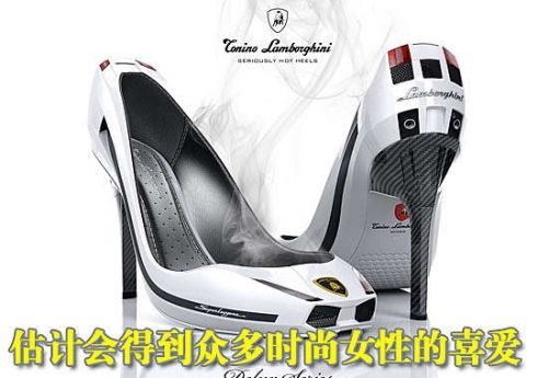 今天我們給您帶來的是蘭博基尼的高跟鞋。這是一雙白色的高跟鞋。從圖片上可以看到這雙白色高跟鞋的部分還些許展現了蘭博基尼蓋拉多車型的模樣。