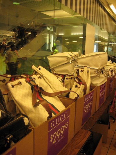 來過幾次廣場都沒有注意到這個地方,大概是因為那個時候我還沒有去過Woodbury,沒經歷過美國購物文化大掃盲,那時候我即使看到了也不會往心里去吧,而現在的我則兩眼放光、抬步上樓、沖了進去。 賣場里人頭攢動,中文、韓文、日本話不絕于耳。Gucci的三四款大包,$299-499一個,小手袋$99,還有帽子、絲巾、小熊、制冰盒、皮球(這個干什么用的)以原價來講算便宜了,但比專家指導我的價格相比還是高了點,且沒有什么好東西了,我理性地只看不買。