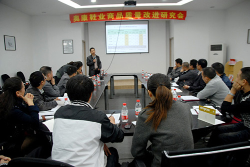 【中國鞋網-品牌觀察】 “總結思考 研討提升”2010年奧康鞋業商品質量改進研討會近日在千石制造中心召開,各制造中心生產部副總經理、質量部經理、工藝處主管,研究院技術部主管、質量本部各片區質檢處主管等相關人員參加了研討會。會議圍繞過去11個月的質量工作開展情況、存在的不足及2011年質量管控新思路和想法展開了熱烈討論和碰撞。