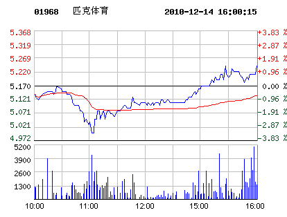 | 匹克體育代碼:01968.hk | 5.230.06 1.16%2010-12-14 16:00:15 | 昨收:5.17 今開:5.17 成交:140017最高:5.25 最低:4.99 均價:5.14流通:20.98億 市值:109.72億 換手:0.01% |