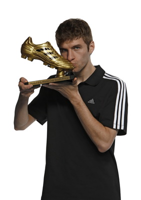 繼其德國隊隊友克洛澤奪得2006年阿迪達斯金靴獎后,托馬斯•穆勒因世界杯上5個進球和3次助攻獲得阿迪達斯金靴獎。“我非常驕傲能獲得阿迪達斯金靴獎,我甚至沒想過我會有機會參加世界杯。我希望,在2011年能夠為我的俱樂部和國家隊不斷進球。”