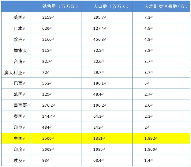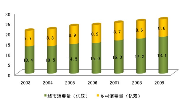 根據國家統計局對中國鞋類消費市場的分析,2003年中國城鎮、農村消費鞋類產品分別為13.4、7.7億雙,到2009年則分別達到18.1和8.6億雙,總量為26.7億雙,超過美國的21億雙。