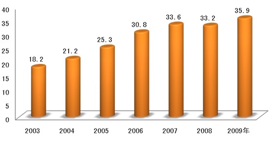 圖表 7 2003-2009年中國皮鞋產量情況(億雙)