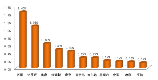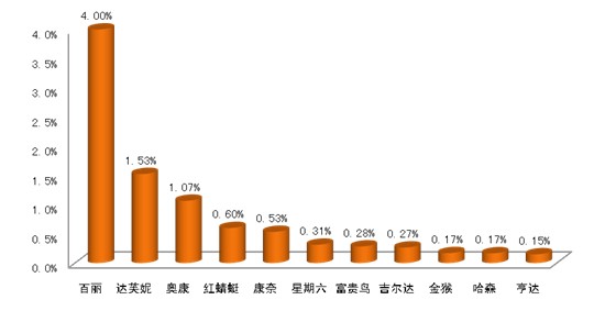 就各重點企業的核心品牌來說,在終端零售市場上,百麗品牌的市場份額仍居首位,為1.45%,其余依次是達芙妮(1.08%)和奧康(0.63%),與各品牌所隸屬企業的市場份額排名情況相同。