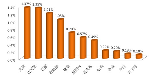 在華東區域的終端消費市場上,在各重點企業的核心品牌中,奧康品牌的市場份額超越達芙妮(1.35%)和百麗(1.21%),成為本區域第一品牌,其市場份額為1.37%。浙江品牌奧康憑借本地優勢資源,大力發展華東市場,取得了領先的地位。