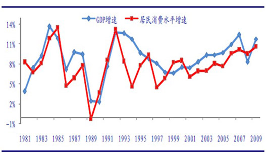 多年以來,居民消費一直是中國經濟中的一塊短板,消費占GDP的比重只有三成多,遠低于歐美國家70%的水平。2009年,由于4萬億投資計劃效果的顯現,消費對經濟增長的貢獻率首次達到50%以上,消費對經濟的拉動作用明顯增強,中國經濟的增長方式開始轉變。未來消費將成為推動中國經濟增長的主要動力,而高速的經濟增長又反過來刺激消費的增長,中國的經濟增長將進入良性發展階段。