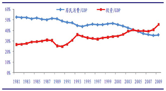 圖表 2 中國居民消費/GDP增速與投資/GDP增速比較