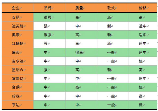 在品牌、質量和款式方面,百麗和奧康處于領先地位;價格方面,百麗和星期六相比其它品牌較高,奧康、達芙妮等適中,更符合大多數消費者的購買力。