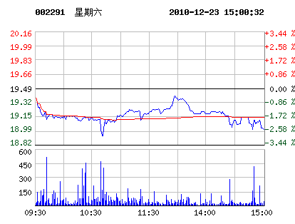 | 星期六 代碼:002291.sz | 18.980.51 2.62%2010-12-23 15:00:32 | 昨收:19.49 今開:19.37 成交:12,744最高:19.40 最低:18.88 均價(jià):19.12 市盈率:52.61流通:0.93億 市值:53.05億元 換手:1.37% |