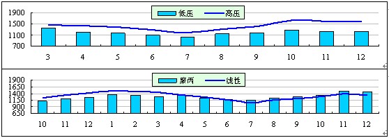 A、聚乙烯(PE):十二月份市場走勢明顯偏軟,盡管上旬市場在茂名、鎮海石化乙烯裂解裝置檢修,市場資源供應銳減,以及石化企業推價等利好消息刺激下一度升溫,價格小幅挺進100元,可惜也只是曇花一現,進入中旬,市場行情終因需求不振和經濟預期不確定以及資金回籠壓力而重現疲勢,價格下挫100-200元,其中高壓、線性跌勢偏強,成交有價無市;下旬在油價高位運行的強烈支撐,市場抑勢稍有緩解,價格試探推高200元,成交未見同步跟進。