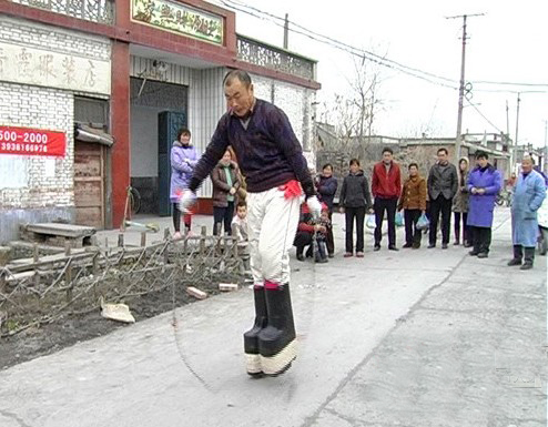 身板硬朗、談笑風生的原國勝當即就穿上620斤的鐵鞋演示。穿上狀如雨靴、高達70多厘米的鐵鞋,儼然巨人的原國勝,吆喝著走起來,雖然是一步一挪,著實不易,但很快就從5米寬的院子一頭走到了另一頭,然后,他竟然穩穩當當地倒退起來,一步一步,一會功夫,又退回了起點。旁邊屏息靜觀者終于忍不住紛紛鼓掌、叫好!