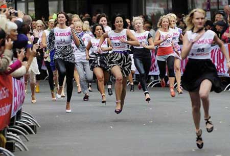 【中國鞋網(wǎng)-滾動快訊】 德國首都柏林舉行了一場“高跟鞋百米短跑大賽”,賽會規(guī)定參賽者所穿的高跟鞋不得低于7公分。眾多女性勇敢的參加了這一比賽。