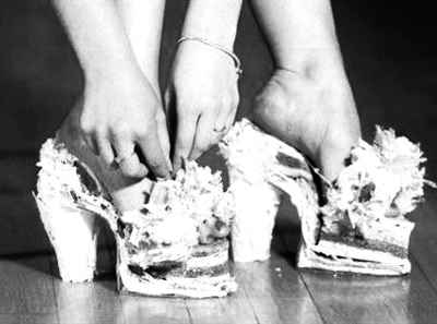 英國巴斯思帕大學女大學生麗莎·迪琳就是這雙鞋子的設(shè)計者,學習3D設(shè)計和紡織專業(yè)的麗莎對時尚的把握很是到位。麗莎用干酪制作出兩個結(jié)實的鞋跟和一層厚厚的鞋底,待定型后,麗莎又用面包做出了鞋面和花式裝飾物。由于奶酪本身就有黏性,加熱烘干后跟面包屑結(jié)合得很堅實,所以,穿上這雙鞋子后走幾步?jīng)]有問題。